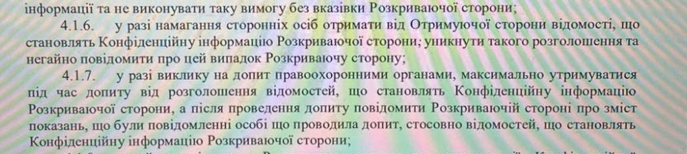 4.1.7 У разі виклику на допит правоохоронними органами максимально утримуватися під час допиту від розголошення відомостей, що становлять Конфіденційну інформацію Розкриваючої сторони, а після проведення допиту, повідомити розкриваючій стороні про зміст показань, що були повідомлені особі що проводила допит, стосовно відомостей, що становлять Конфіденційну інформацію інформацію Розкриваючої сторони;